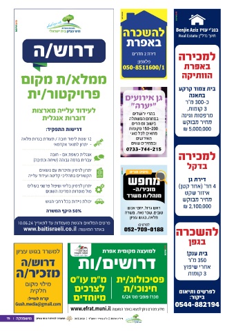 פרטים המלאים והגשת מועמדות עד לתאריך 10.06.24 טובים ,שכר נאה ,משרה להשכרה